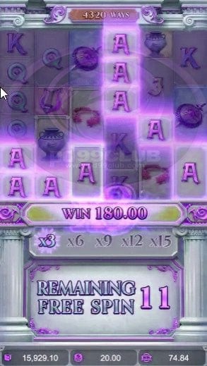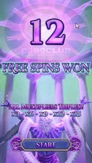 - สัญลักษณ์ Scatter 4 ตัวที่อยู่ในตำแหน่งใดๆ ก็ตามจะเริ่มฟีเจอร์การหมุนฟรี 12 รอบ