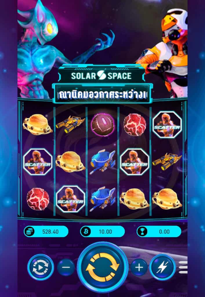 - Solar Space เป็นเกมสล็อตวีดีโอแบบ 5 คอลัมน์ 3 แถว ที่มีฟีเจอร์การหมุนฟรีพร้อมตัวคูณสูงสุดถึง x150