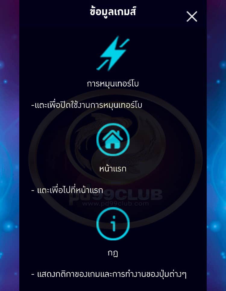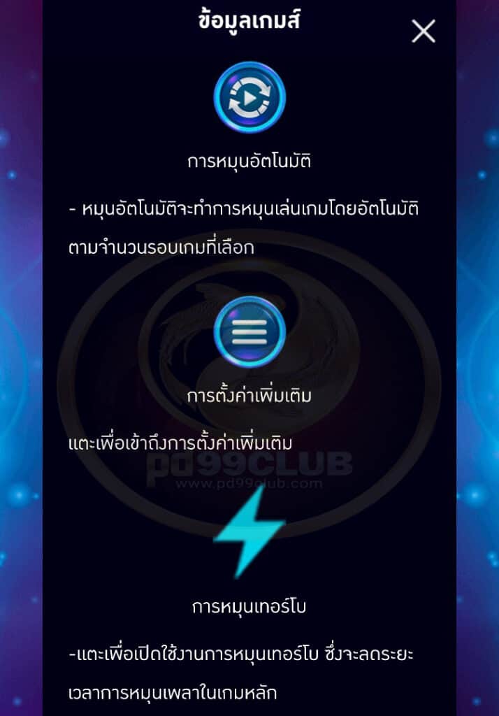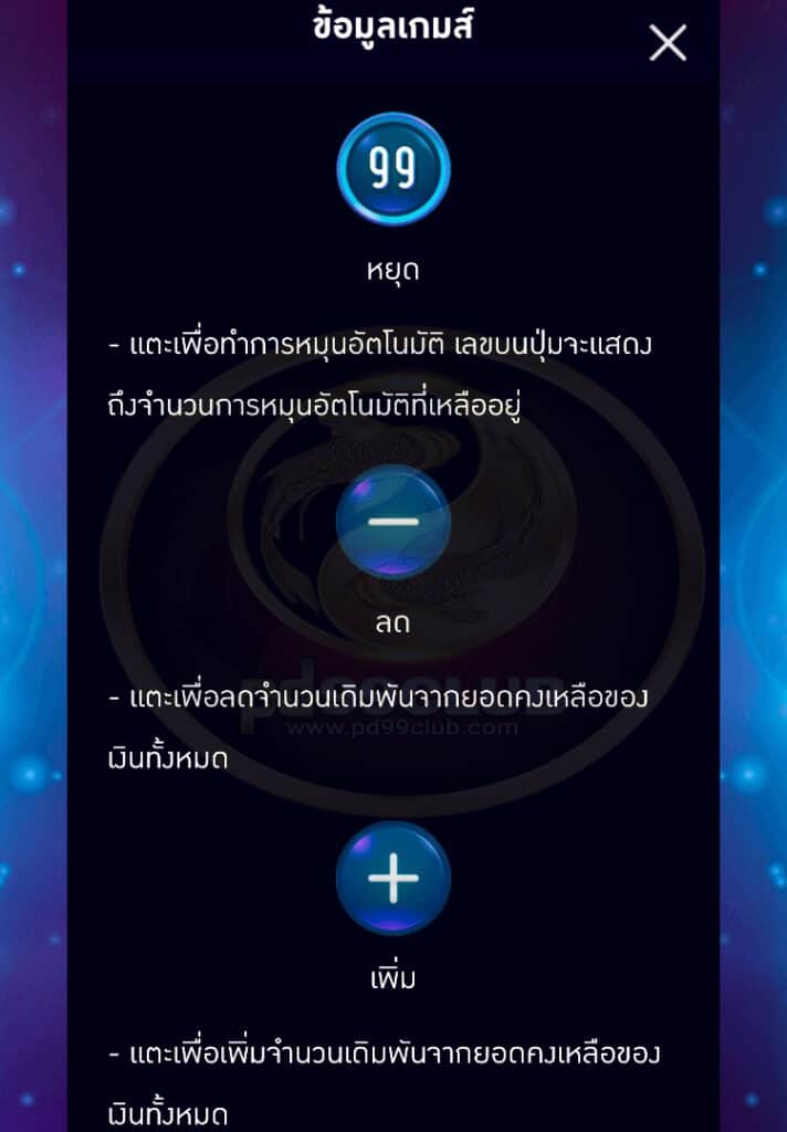 - “หมุนอัตโนมัติ” จะทำการหมุนเล่นเกมโดยอัตโนมัติตามจำนวนรอบเกมที่เลือก