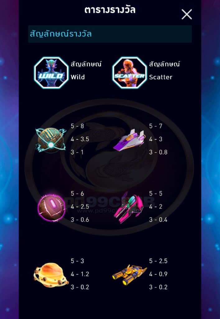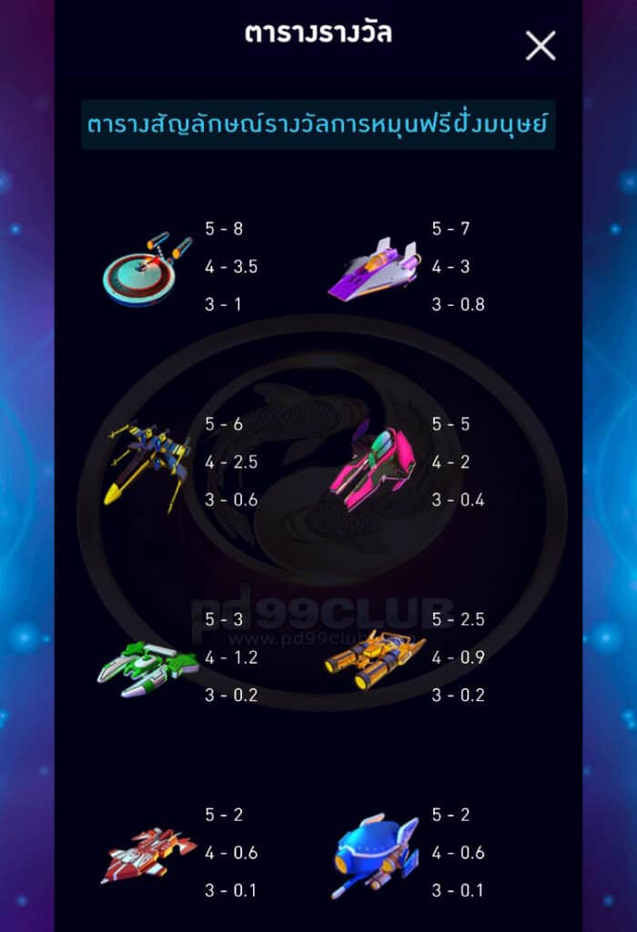 - ตารางสัญลักษณ์รางวัลการหมุนฟรีฝั่งมนุษญ์ต่างดาวเกม Solar Space มีทั้งหมด 8 สัญลักษณ์