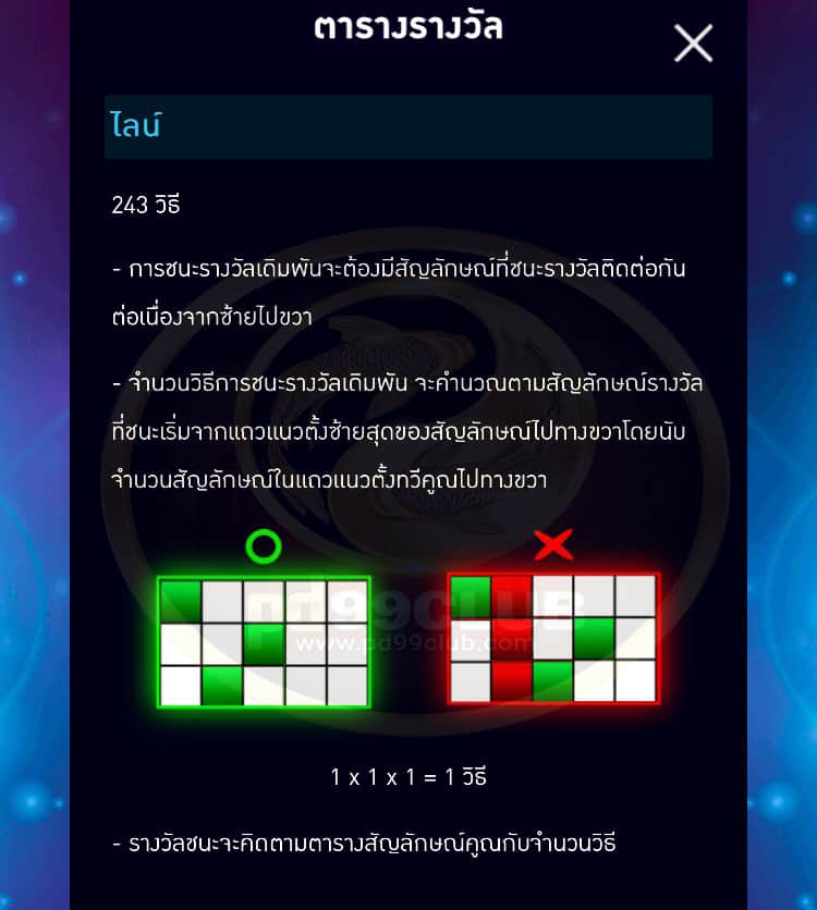 - รางวัลจากการเดิมพันจะเท่ากับจำนวนที่เเสดงใน “ตารางการจ่ายเงินรางวัล” คูณด้วยไลน์ และจำนวนเดิมพัน