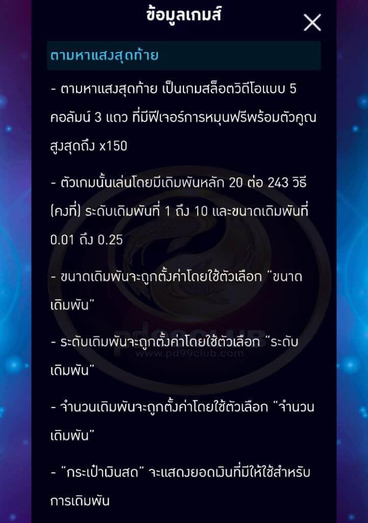 - ตัวเกมนั้นเล่นโดยมีเดิมพันหลัก 20 ต่อ 243 วิธี(คงที่) ระดับเดิมพันที่ 1 ถึง 10 เเละขนาดเดิมพันที่ 0.01 ถึง 0.25