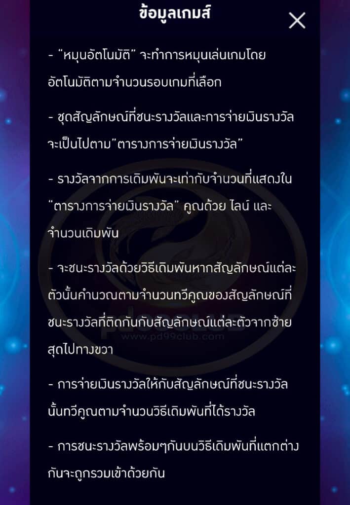 - ชุดสัญลักษณ์ที่ชนะรางวัลเเละการจ่ายเงินรางวัลจะเป็นไปตาม “ตารางการจ่ายเงิน”