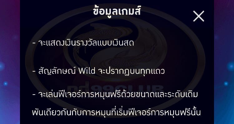 - จะเล่นฟีเจอร์การหมุนฟรีด้วยขนาดและระดับเดิมพันเดียวกันกับการหมุนที่เริ่มฟีเจอร์การหมุนฟรีนั้น