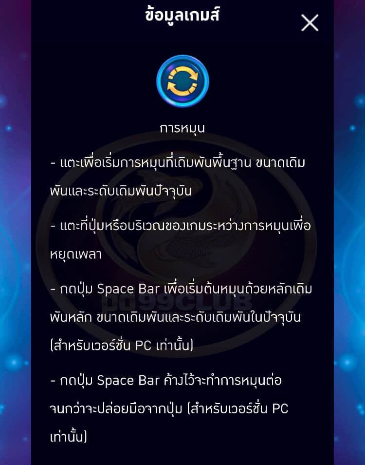- กดปุ่ม Space Bar ค้างไว้จะทำการหมุนต่อจนกว่าจะปล่อยมือจากปุ่ม (สำหรับเวอร์ชั่น PC เท่านั้น)