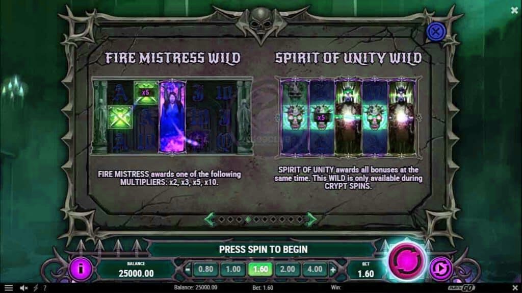 - Spirit of Unity จะให้โบนัสทั้งหมดพร้อมกัน Wild นี้จะมีอยู่ในระหว่าง Crypt Spins เท่านั้น