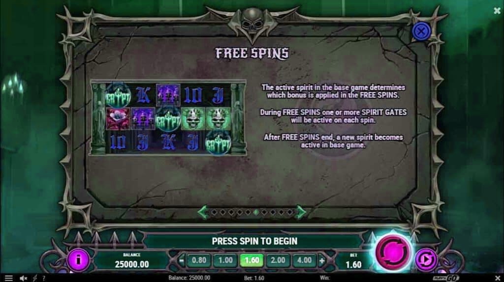 - จิตวิญญาณที่ทำงานในเกมหลักจะเป็นตัวกำหนดว่าโบนัสใดจะถูกนำไปใช้ใน Free Spins
