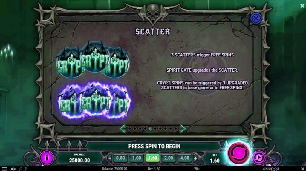 - สามารถเริ่ม Crypt Spins ได้ด้วย Upgraded Scatters 3 อันในเกมหลักหรือใน Free Spins