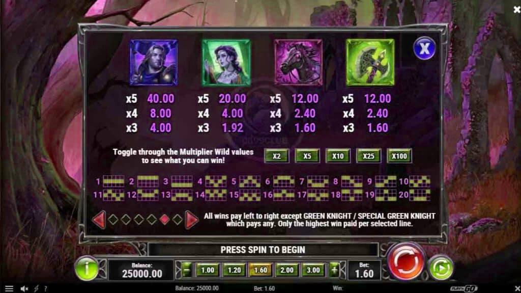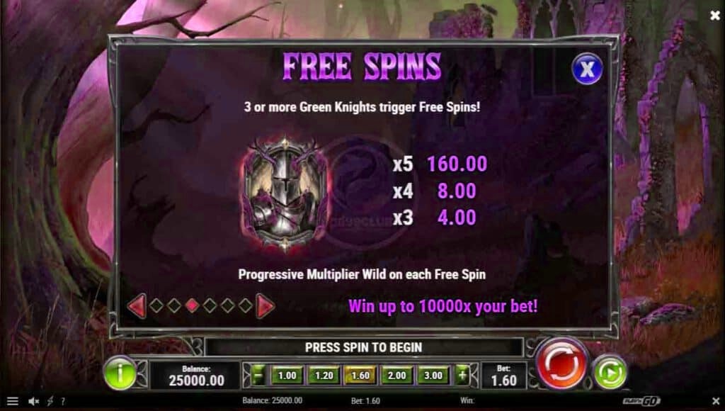 อาศัยคุณสมบัติพิเศษที่หลากหลาย และบางคุณสมบัติก็ค่อนข้างน่าประทับใจ มันอาจจะไม่ใช่กรณีของสัญลักษณ์เสริมทั่วไป แม้ว่าจะสามารถจ่าย 100x ของเงินเดิมพันในแต่ละบรรทัดที่มันครอบคลุมทั้งหมด และเวลาที่เหลือก็สามารถทดแทนได้ ไวด์ทวีคูณยังเป็นไปได้และสิ่งเหล่านี้สามารถเพิ่มชัยชนะได้ 100x , 25x , 10x , 5x หรือ 2x ด้วยภาพลักษณ์ที่เกือบจะเหมือนผีของ Green Knight ที่แสดงในชุดเกราะของเขาและล้อมรอบด้วยออร่าสีเขียว เราได้รับสัญลักษณ์กระจายซึ่งสามารถกระตุ้นการหมุนฟรี ให้แสดง 3 , 4 หรือ 5 รายการเพื่อรับรางวัล (สูงสุด 100x ของเงินเดิมพัน) และรับ 5 ฟรีสปิน แม้ว่าจะมีเพียง 5 รอบเท่านั้น แต่แต่ละรอบจะได้รับสัญลักษณ์ตัวคูณเสริมที่เพิ่มเข้ามาในมุมมอง รอบแรกจะได้รับตัวคูณไวด์ 2x , ตัวที่สองมีตัวคูณ 5x , รอบที่สามได้ไวด์ 10x จากนั้นไวด์ 25x สำหรับสปินที่สี่และสุดท้ายตัวคูณไวด์ 100x สำหรับสปินที่ห้าและรอบสุดท้าย ในระหว่างเกมฟรีคุณสามารถเข้าถึง Shield Spins ได้ อีกครั้งที่คุณมี 5 รอบที่ต้องผ่าน โดยใช้ตัวคูณไวด์จากรอบทริกเกอร์ด้วยวิธีนี้ คุณสามารถมี 5 สปินพร้อมตัวคูณไวด์ 100 เท่า