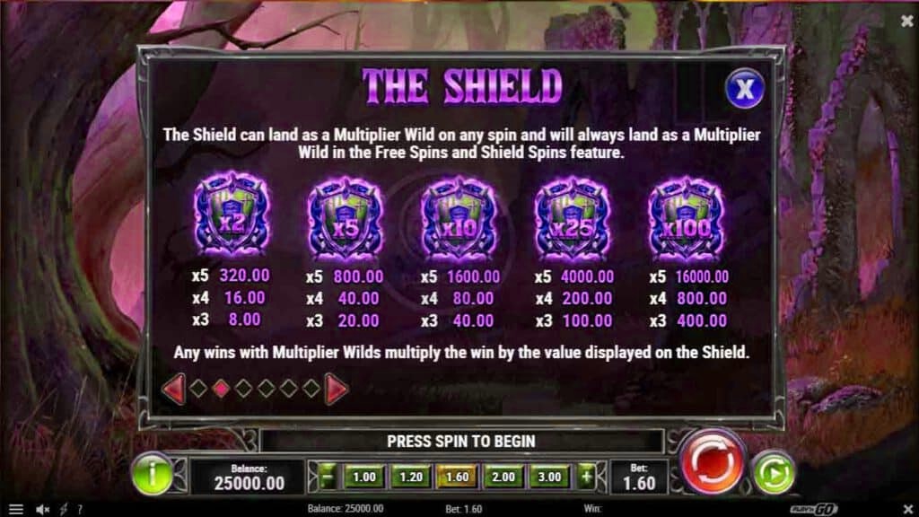 – x3 = 400.00 - การนะใดก็ตามที่มี Multiplier Wilds จะคูณการชนะตามมูลค่าที่แสดงอยู่บน Shield