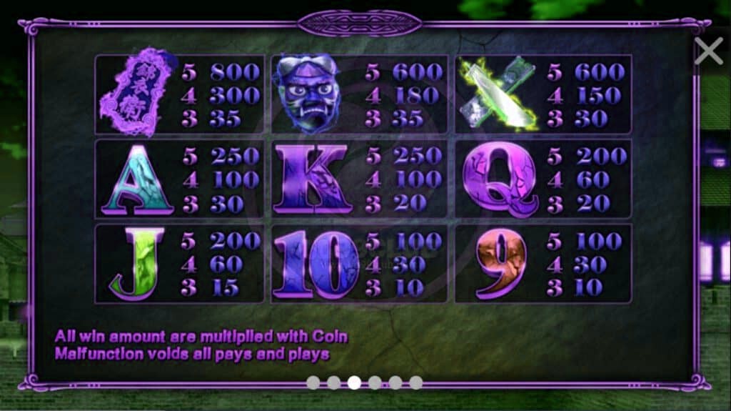 - สัญลักษณ์อักษร 10 สัญลักษณ์อักษร 9 : เงินรางวัลตามจำนวนวงล้อ ดังนี้ 5 , 4 , 3 วงล้อ จ่าย 100 , 30 , 10 เหรียญ คูณจำนวนเงินวางเดิมพันทั้งหมด