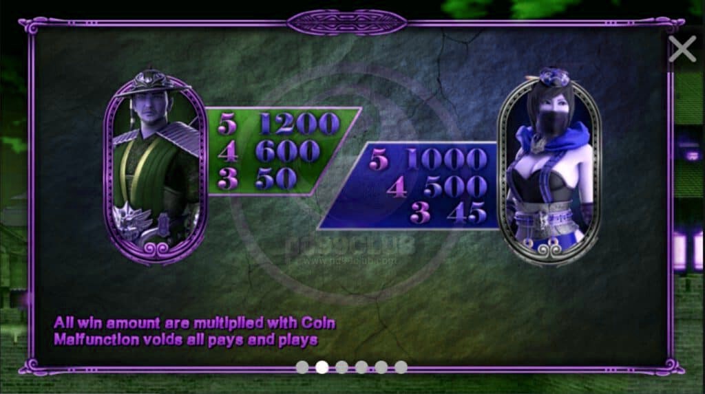- หน้ากาก : เงินรางวัลตามจำนวนวงล้อ ดังนี้ 5 , 4 , 3 วงล้อ จ่าย 600 , 180 , 35 เหรียญ คูณจำนวนเงินวางเดิมพันทั้งหมด
