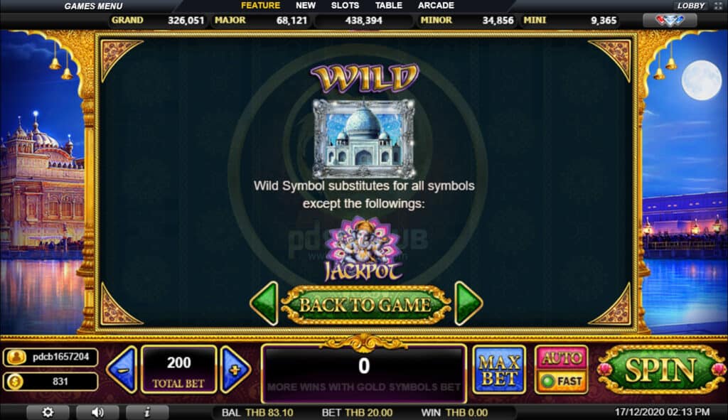 สัญลักษณ์ Wild สามารถใช้ทดแทนทุกสัญลักษณ์ยกเว้นสัญลักษณ์ Jackpot