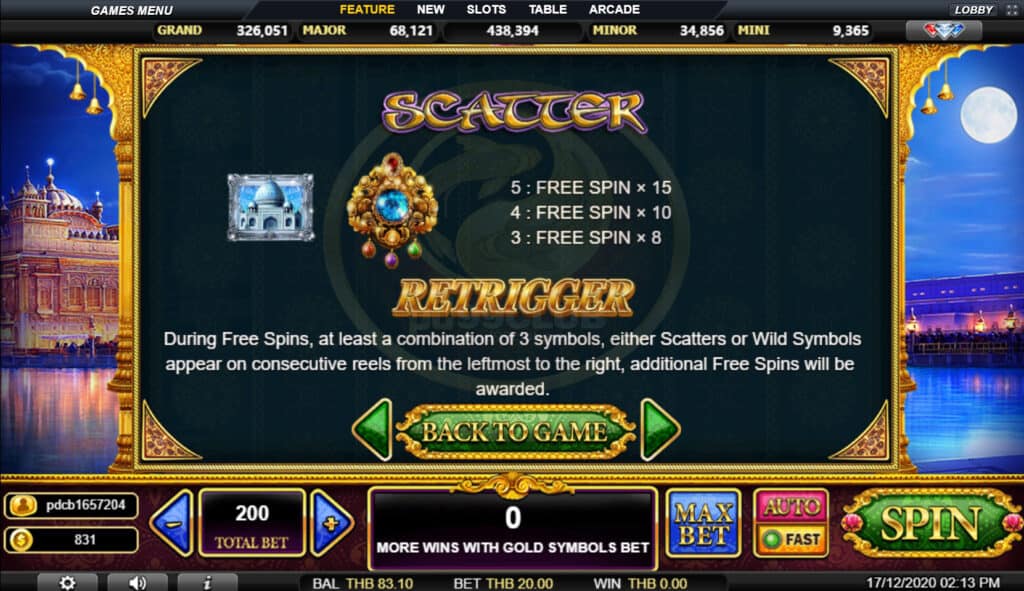 สัญลักษณ์ Scatter Retrigger ในระหว่างฟรีสปินจะมีการรวมกันอย่างน้อย 3 สัญลักษณ์ทั้ง Scatters หรือ Wild Symbols จะปรากฏบนวงล้อต่อเนื่องกันจากซ้ายสุดไปทางขวาจะได้รับรางวัลฟรีสปินเพิ่มเติม