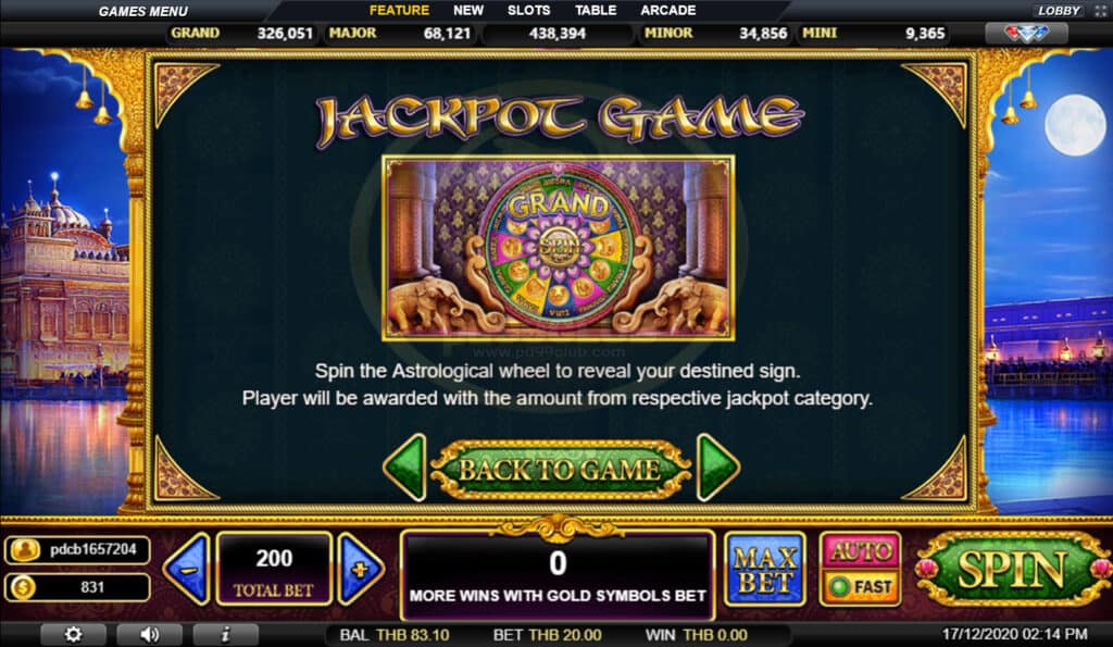 สัญลักษณ์ Jackpot Game หมุนวงล้อโหราศาสตร์เพื่อเปิดเผยสัญลักษณ์แห่งโชคชะตาของคุณ ผู้เล่นจะได้รับรางวัลเป็นจำนวนเงินจากประเภทแจ็คพอตตามลำดับ