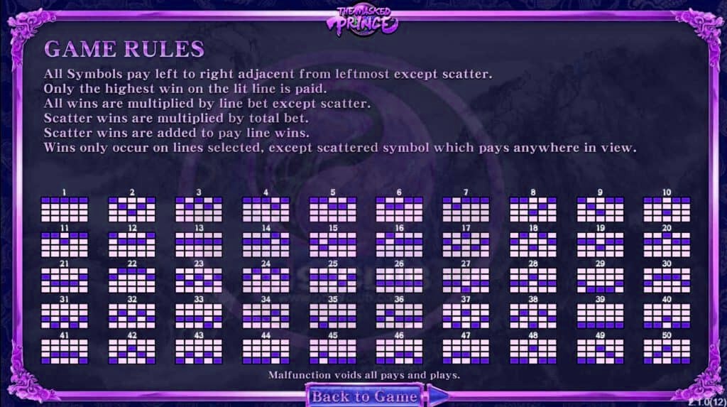 - ไลน์เดิมพันที่ชนะรางวัลมีทั้งหมด 50 ไลน์เดิมพัน