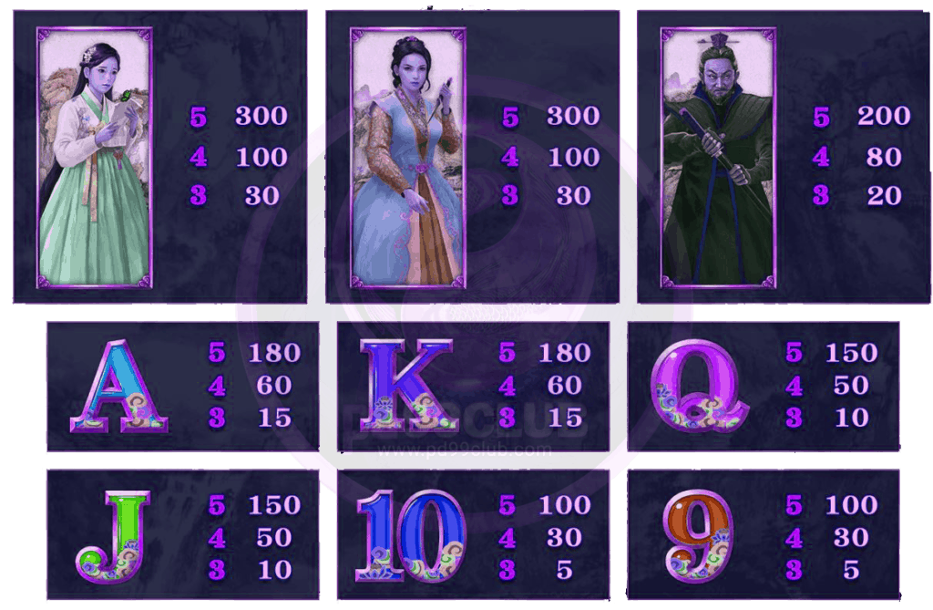 อัตราการจ่ายของเกม The Masked Prince - สัญลักษณ์ผู้หญิงชุดสีม่วง และสัญลักษณ์ผู้หญิงชุดสีชมพู ติดกัน 3 ตัว อัตราการจ่ายเงินรางวัลที่คูณ 30 หากออกติดกัน 4 ตัว คูณ 100 หากออกติดกัน 5 ตัวคูณ 300