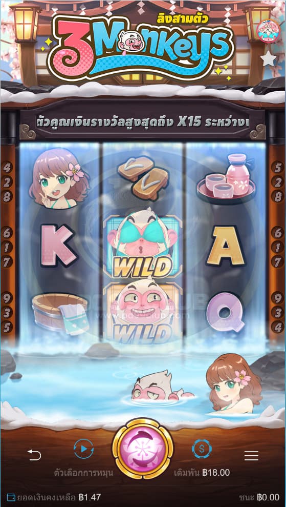 Three Monkeys เป็นเกมสล็อตวิดีโอแบบ 3 เพลา 3 แถว ที่มี Wild และการหมุนซํ้าพร้อมตัวคูณแบบเพิ่มสูงขึ้น