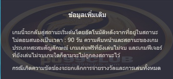เกมนี้จะกลับสู่สถานะเริ่มต้นโดยอัตโนมัติหลังจากที่อยู่ในสถานะไม่ตอบสนองเป็นเวลา: 90 วันความคืบหน้าและสถานะของเกมประเภทสะสมสัญลักษณ์เกมเล่นฟรีที่ยังเล่นไม่จบและเกมฟีเจอร์ที่ยังเล่นไม่จบเกมใดก็ตามจะไม่ถูกคงสถานะไว้