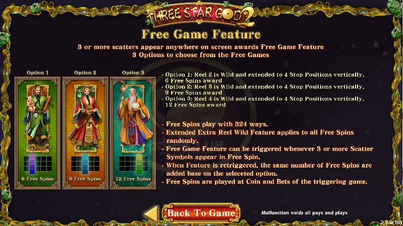 สัญลักษณ์ Scatter ตัวหรือมากกว่าปรากฏที่ใดก็ได้บนหน้าจะได้รับรางวัลฟรีเจอร์เกมฟรี 3 ตัวเลือกให้เลือกจากเกมฟรี