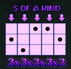- จํานวนของสัญลักษณ์ในแถวที่เจาะจงซึ่งปรากฏบนแถวที่เลือกไว้จะทำให้ได้รางวัลรางวัลเป็นไปตามตารางรางวัลแถวเดิมพันไม่ได้มีเพียงแนวนอนของวงล้อเท่านั้น แต่ยังนับในแนวทแยงซีกแซีกด้วยแถวสามารถประกอบด้วยสัญลักษณ์ในแถวแนวนอนที่สองของวงล้อแรกแถวแนวนอนที่สองของวงล้อที่สองแถวแนวนอนที่สามของวงล้อที่สามแถวแนวนอนที่สองของวงล้อที่สี่และแถวแนวนอนที่สองในวงล้อที่ห้า