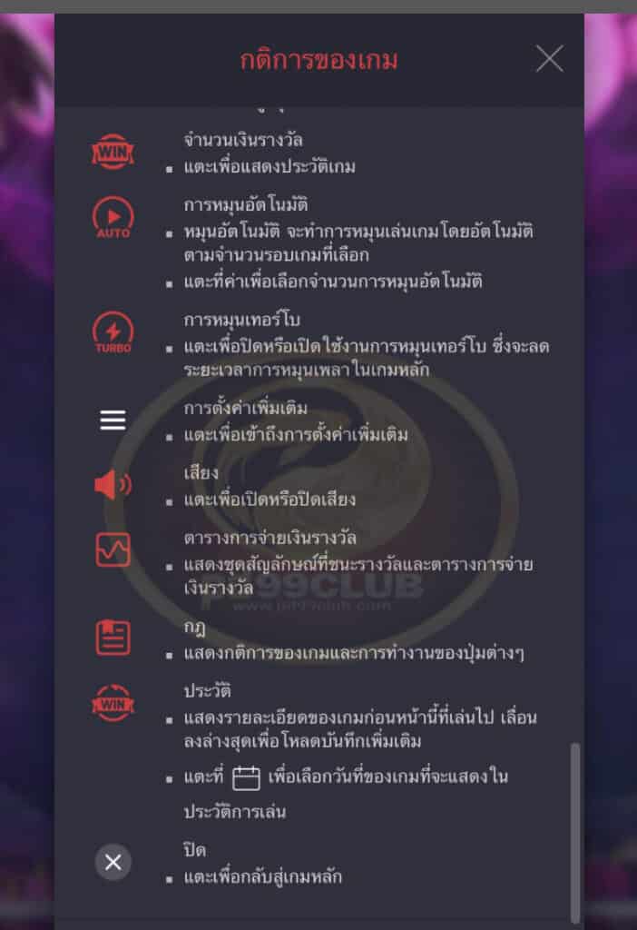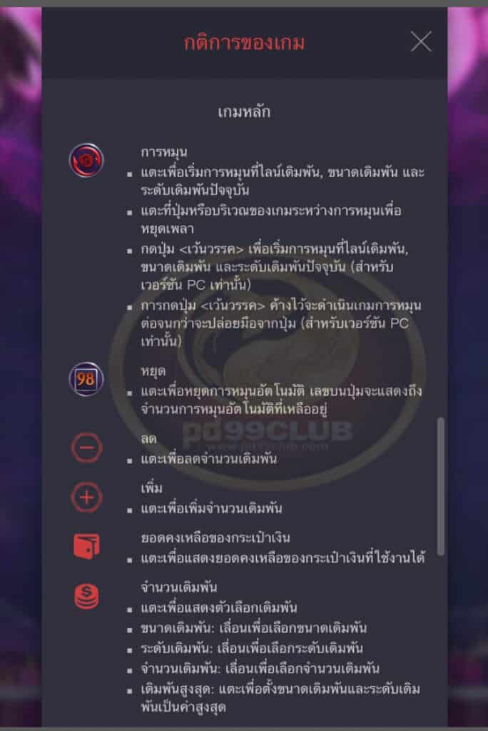 - หมุนอัตโนมัติจะทำการหมุนเล่นเกมโดยอัตโนมัติตามจำนวนรอบเกมที่เลือก