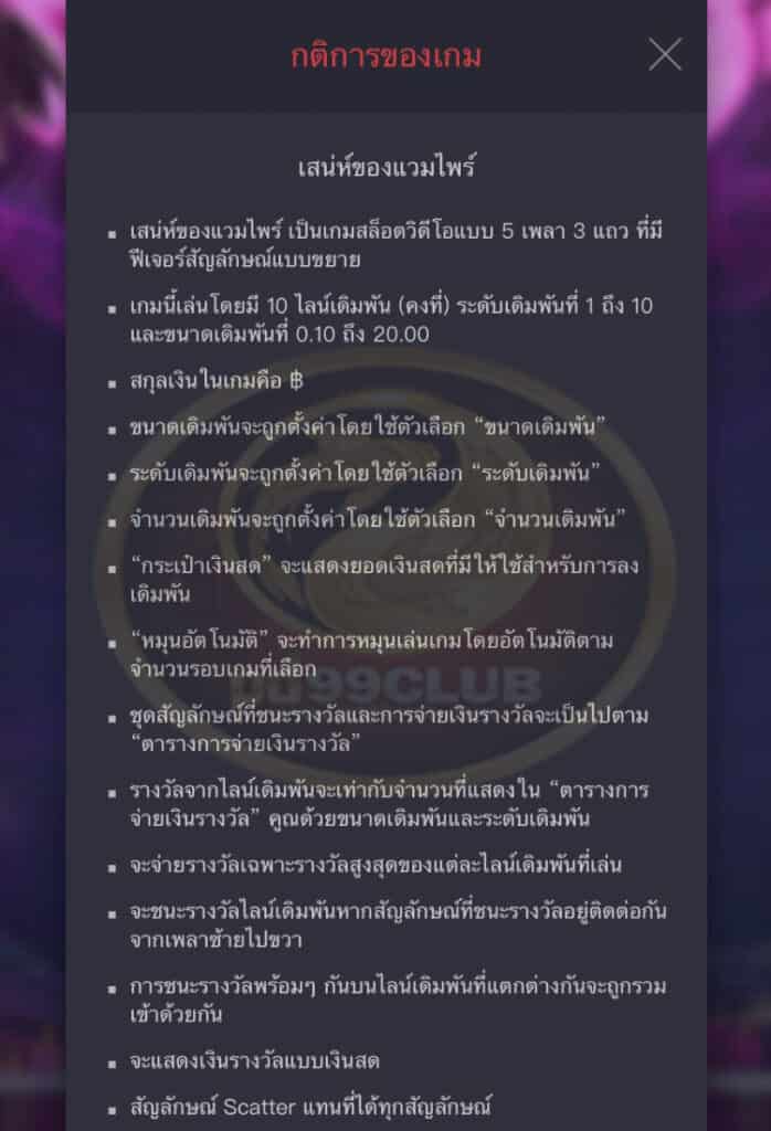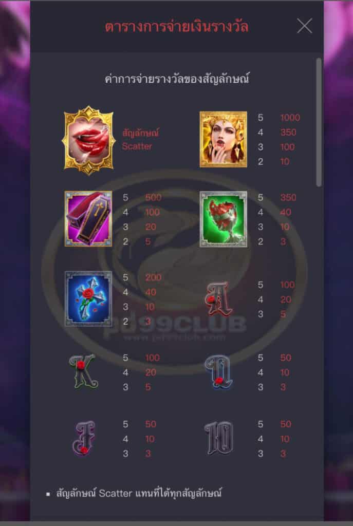 - จะแสดงชุดสัญลักษณ์ที่ชนะและตารางการจ่ายเงิน