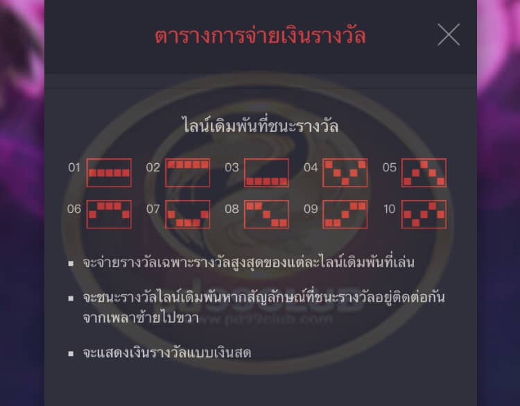 - จะชนะรางวัลเฉพาะรางวัลสูงสุดของเเต่ละไลน์เดิมพันที่เล่น