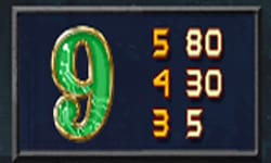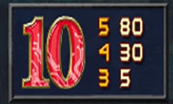 - สัญลักษณ์อักษร 10 และสัญลักษณ์อักษร 9 สัญลักษณ์เชื่อมต่อกันจากซ้ายไปขวา 5 สัญลักษณ์ อัตราการจ่ายอยู่ที่ 80 บาท