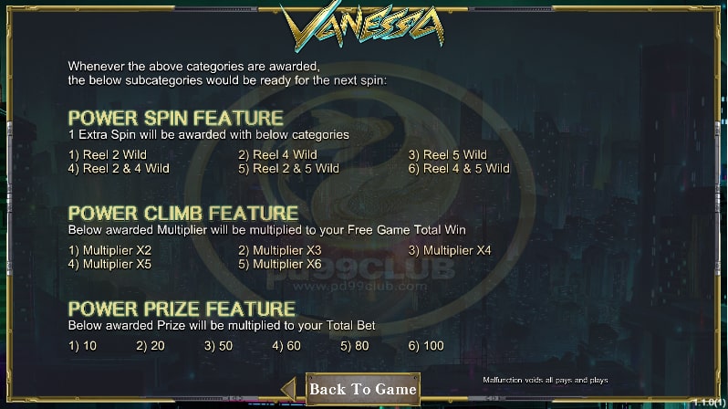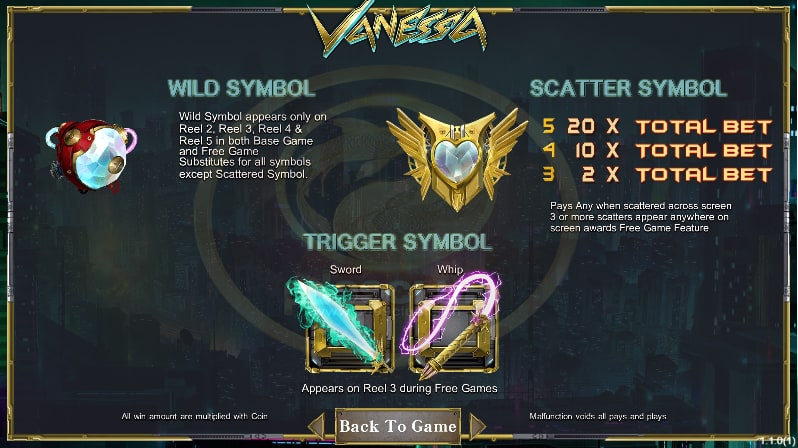 - สัญลักษณ์อัตราการจ่ายสูงสุดของเกม Vanessa มีทั้งหมด 6 สัญลักษณ์ เช่น