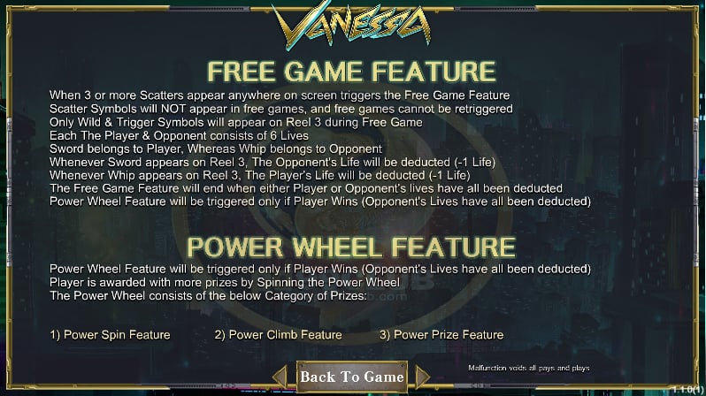 - เฉพาะสัญลักษณ์ไวลด์และทริกเกอร์เท่านนที่จะปรากฏบนวงล้อ 3 ระหว่างฟรีเกมทั้งผู้เล่นและผ่ายตรงข้ามจะมี 6 ชีวิต
