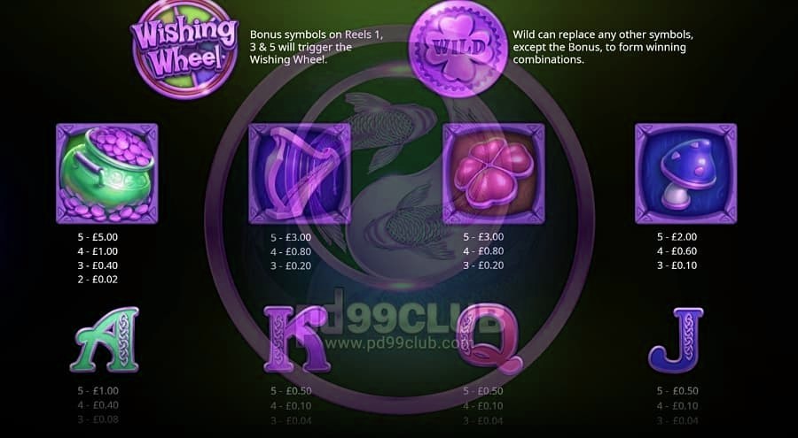 สัญลักษณ์ของ Wishing Wheel ตรงกับที่คุณคาดหวังจากเกมสล็อตธีมไอริช คุณอาจจะบอกว่าพวกเขาไม่ได้มีจินตนาการมากแต่พวกเขาจะสมบูรณ์แบบกับเรื่องทั้งหมด ตารางการชำระเงินขั้นต่ำสัญลักษณ์ประกอบด้วยไอคอนโป๊กเกอร์ J Q K และ A สัญลักษณ์พิเศษ ได้แก่ พิณ โคลเวอร์สี่ใบ เห็ด และทองคำ อันหลังเป็นสัญลักษณ์ตารางการจ่ายเพียงอันเดียวที่จะจ่ายออกหากคุณจัดการได้เพียงสองอันในหนึ่งใน 20 เพย์ไลน์ Wishing Wheel มาพร้อมกับสัญลักษณ์ Wild เพื่อแทนที่สัญลักษณ์ดังกล่าว คราวนี้เป็นใบโคลเวอร์สีทอง