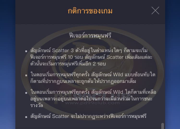 - จะเล่นฟีเจอร์การหมุนฟรีด้วยขนาดและระดับเดิมพันเดียวกันกับการหมุนที่เริ่มฟีเจอร์การหมุนฟรีนั้น