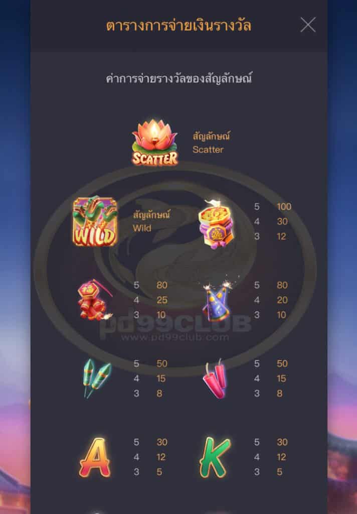 - เเสดงชุดสัญลักษณ์ที่ชนะรางวัลเเละตารางการจ่ายเงินรางวัล