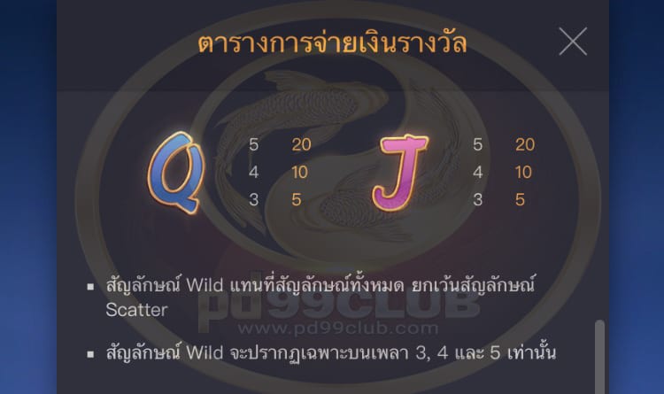 - สัญลักษณ์ Wild จะปรากฏเฉพาะบนเพลา 3,4 และ 5 เท่านั้น