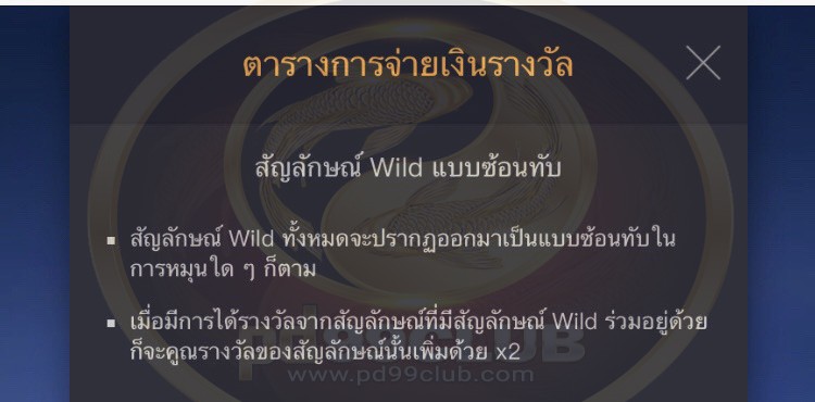 - เมื่อมีการได้รางวัลจากสัญลักษณ์ที่มีสัญลักษณ์ Wild ร่วมอยู่ด้วยก็จะคูณรางวัลของสัญลักษณ์นั้นเพิ่มด้วย x2