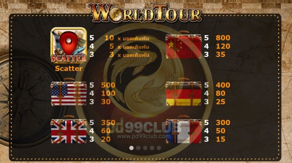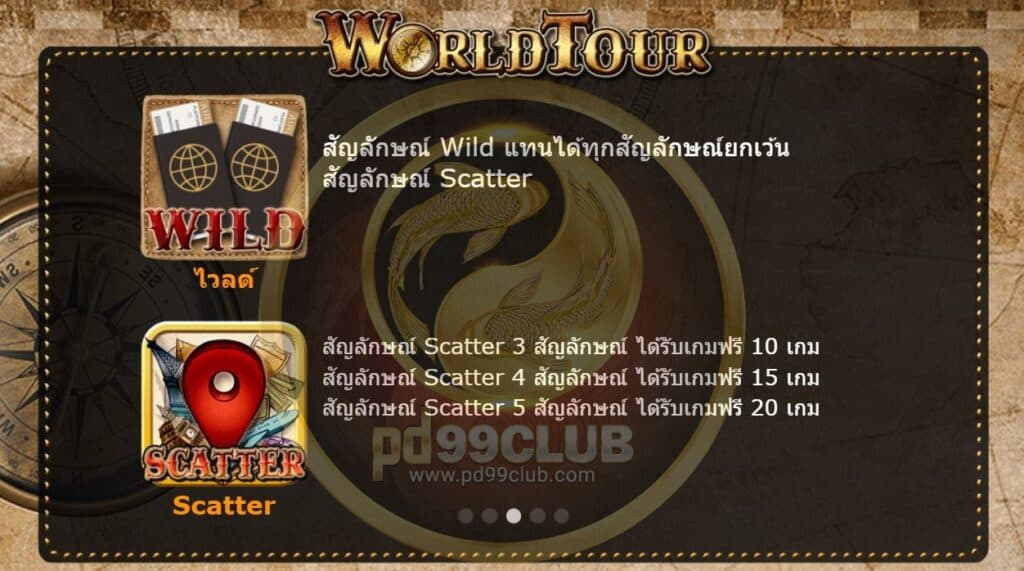 มาจ้าวันนี้แอดมินจะมาแนะนำเกมส์สล็อตเกมส์ใหม่แตกดีเฮงปัง แตกง่ายยิ่งกว่าปอกกล้วยเข้าปากอี๊กกก นั่นก็คือสล็อตเกมส์ World tour ของค่าย amb988 โดยเกมส์สล็อตเกมส์นี้มีรูปแบบการเดิมทางไปทั่วโลก ชมบรรยากาศนั่งเครื่องบิล นั่งรถไฟ หรือจะนั่งเรือดีน๊า โดยเกมส์นี้มีวิธีการชนะรางวัลถึง 243 วิธีซึ่งเกมส์แจกค่อนข้างหนักเดิมพันน้อยก็ได้รางวัลกลับมาอย่างงาม เหมาะสุดๆสำหรับนักเล่นมือใหม่หรือเก่าที่ยังไม่เคยลิ้มลองเกมส์นี้แอดมินขอแนะนำเลยโดยเกมส์ๆนี้ เดิมพันขั้นต่ำเพียง 4.50 บาทรูปภาพออกแนวย้อนยุดคลาสสิค มีทั้งเข็มทิศ รูปแบบแผนที่เหนือใต้ ออกตก พร้อมกระเป๋าเดิมทางใบใหญ่ที่จะนำมาสู่เงินรางวัลเต็มกระเป๋า โลเคชั่นน่าตื่นตาตื่นใตเบื้อต้นเรามาชมคลิปแนะนำเกมส์พร้อมความรู้เบื้องต้นของเกมส์นี้กัน ซึ่งเป็นอีกหนึ่งปัจจัยหลักของการจะเล่นเกมส์ใดเกมส์หนึ่ง เราต้องศึกษาว่าในเกมส์นั้นๆ มีสัญักษณืการจ่ายรางวัลโบนัสแจ็กพ็อตหรือฟีเจอร์ฟรีสปินอย่าไรบ้างเพื่อให้เราสปินถูกและคว้ารางวัลกลับบ้านไป ไปชมกันเลยค่ะ