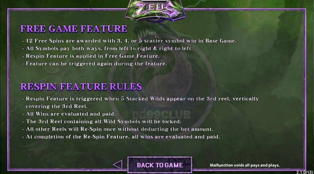- ฟีเจอร์รีสปินจะเปิดใช้เมื่อมีไวลด์ซ้อน 5 ตัวปรากฏบนวงล้อที่ 3 และครอบคลุมวงล้อที่ 3 ในเเนวตั้ง
