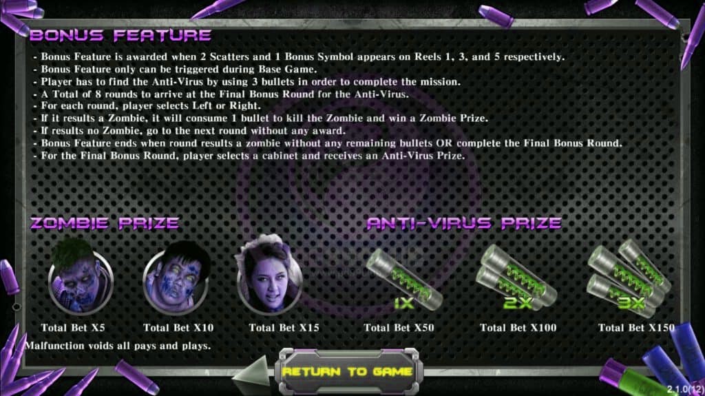 - ฟีเจอร์โบนัสจะสิ้นสุดลงเมื่อผลลัพธ์เป็นซอมบี้ เเต่ไม่มีกระสุนเหลื่ออยู่หรือรอบโบนัสสุดท้ายสิ้นสุดลง