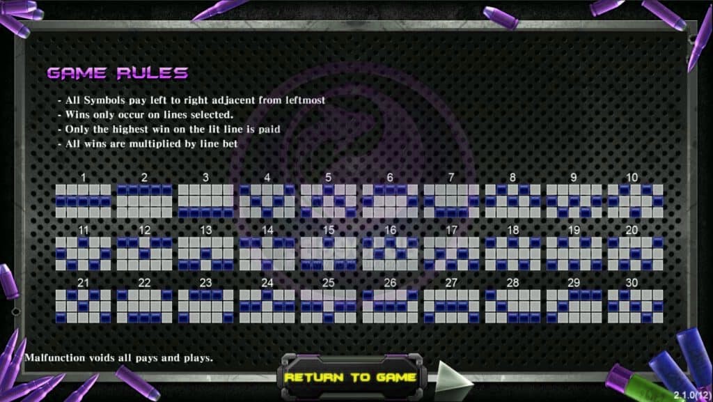 - ปืนกลสั้น ปืนสั้น : เงินรางวัลตามจำนวนวงล้อ ดังนี้ 5 , 4 , 3 วงล้อ จ่าย 80 , 35 , 15 เหรียญ คูณจำนวนเงินวางเดิมพันทั้งหมด