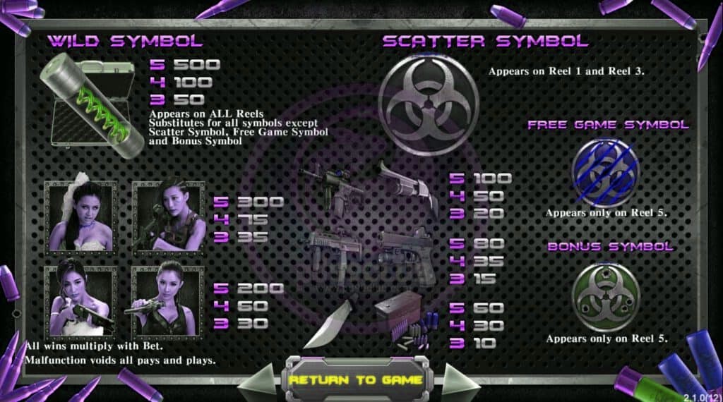 - เจ้าสาวซอมบี้ นักล่าซอมบี้หญิง : เงินรางวัลตามจำนวนวงล้อ ดังนี้ 5 , 4 , 3 วงล้อ จ่าย 300 , 75 , 35 เหรียญ คูณจำนวนเงินวางเดิมพันทั้งหมด